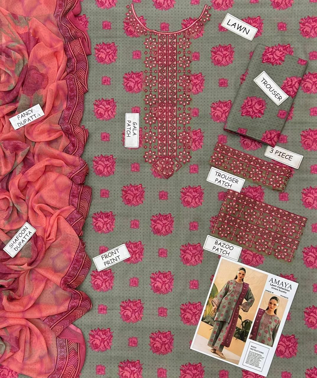 Perfect for daytime gatherings, summer outings, casual festive events, or elegant everyday wear, the Amaya Lawn Embroidered 3 Piece | AA110 offers versatile styling options. Pair it with minimal jewelry and flats for a soft daytime look, or dress it up with heels and statement accessories for a more refined appearance. With its premium lawn fabric, tasteful embroidery, and harmonious color palette, this outfit is a timeless addition to any summer wardrobe, combining comfort, style, and effortless sophistication.