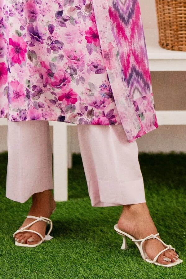 The suit is paired with a delicately printed chiffon dupatta in shades of purple and pink, complementing the floral shirt with an eye-catching contrast. The soft fabric ensures effortless draping, adding flow and sophistication to the overall look. To complete the set, it comes with solid-colored trousers in a light lavender hue, balancing the vibrant shirt and dupatta perfectly while providing comfort and ease of movement.