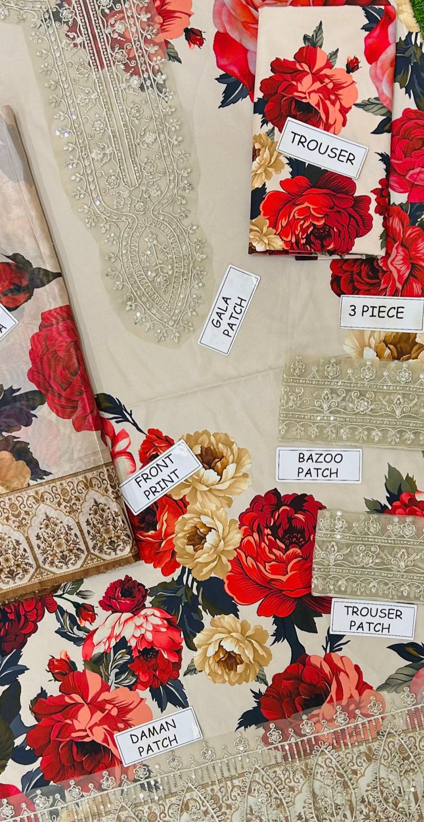 The outfit features a soft beige base adorned with bold, blooming floral prints in rich tones of crimson, maroon, and rose. The intricate embroidery along the neckline and borders is finely detailed with golden threadwork, exuding sophistication and charm. Each stitch enhances the overall design, giving it a regal touch that reflects refined craftsmanship.