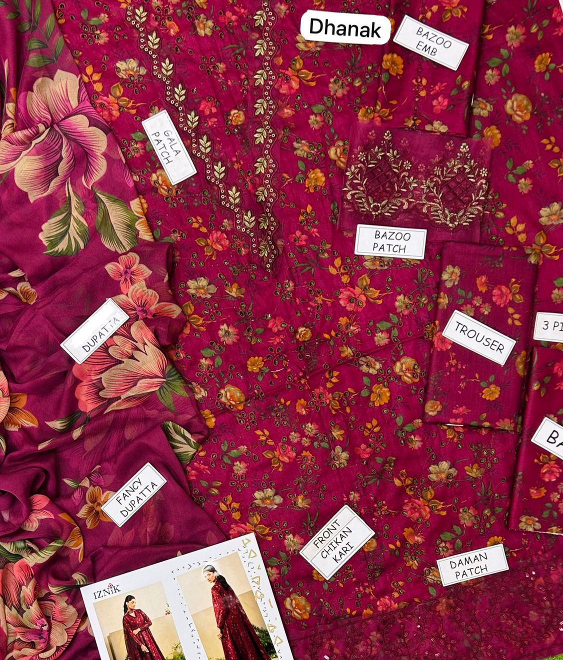 The Iznik Dhanak Embroidered 3 Piece | IZ122 is an elegant blend of timeless sophistication and modern craftsmanship, designed for women who love to embrace tradition with a touch of contemporary grace. Rendered in a rich maroon hue, this ensemble exudes warmth, richness, and a regal charm that makes it a perfect choice for festive gatherings, semi-formal events, or evening occasions.