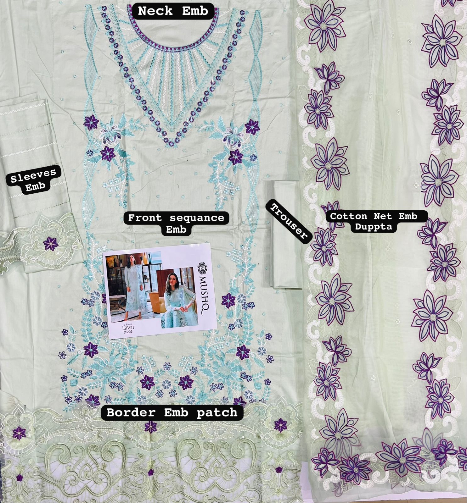 The Mushq Lawn Embroidered 3 Piece | MQ111 is a perfect expression of soft elegance and refined luxury, designed for women who appreciate subtle colors and delicate detailing. This outfit features a soothing mint green lawn base that gives a fresh, graceful, and calming look—ideal for summer wear.