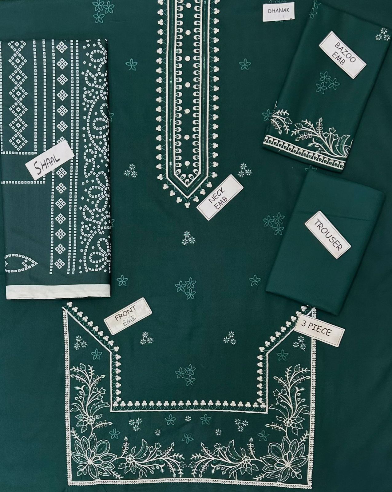 The Ramsha Dhanak Embroidered 3 Piece | RH100 is an exquisite blend of tradition, artistry, and comfort — a winter masterpiece that speaks of elegance with every detail. Designed in a deep teal hue, this outfit beautifully captures the serenity of nature, enhanced by fine embroidery that adds grace and refinement to your seasonal wardrobe.
