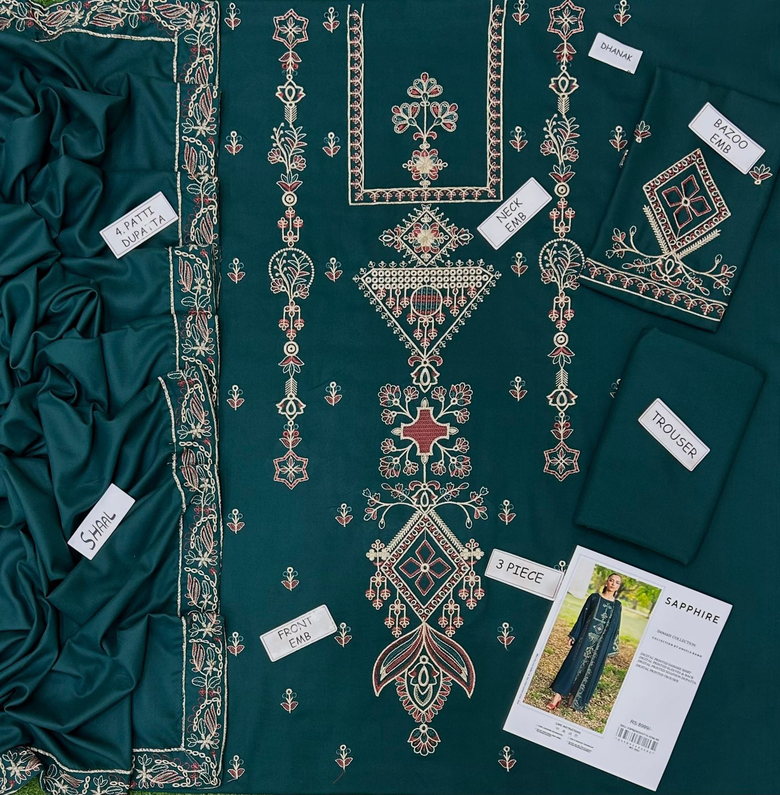 The Sapphire Dhanak Embroidered 3 Piece | SP112 is a celebration of timeless elegance and winter sophistication — a perfect blend of tradition, luxury, and comfort. Designed in a rich emerald green hue, this outfit exudes regal charm and understated grace, making it an ideal choice for the modern woman who values refinement in every detail.