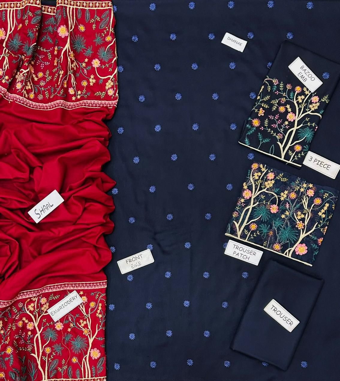 The deep navy-blue shirt is tastefully embroidered with floral motifs on the sleeves, adding a touch of sophistication and femininity. Its straight-cut design and minimal neckline balance classic elegance with modern simplicity. Paired with a richly embroidered maroon shawl, the contrast brings a royal finish to the ensemble — soft, warm, and strikingly beautiful.